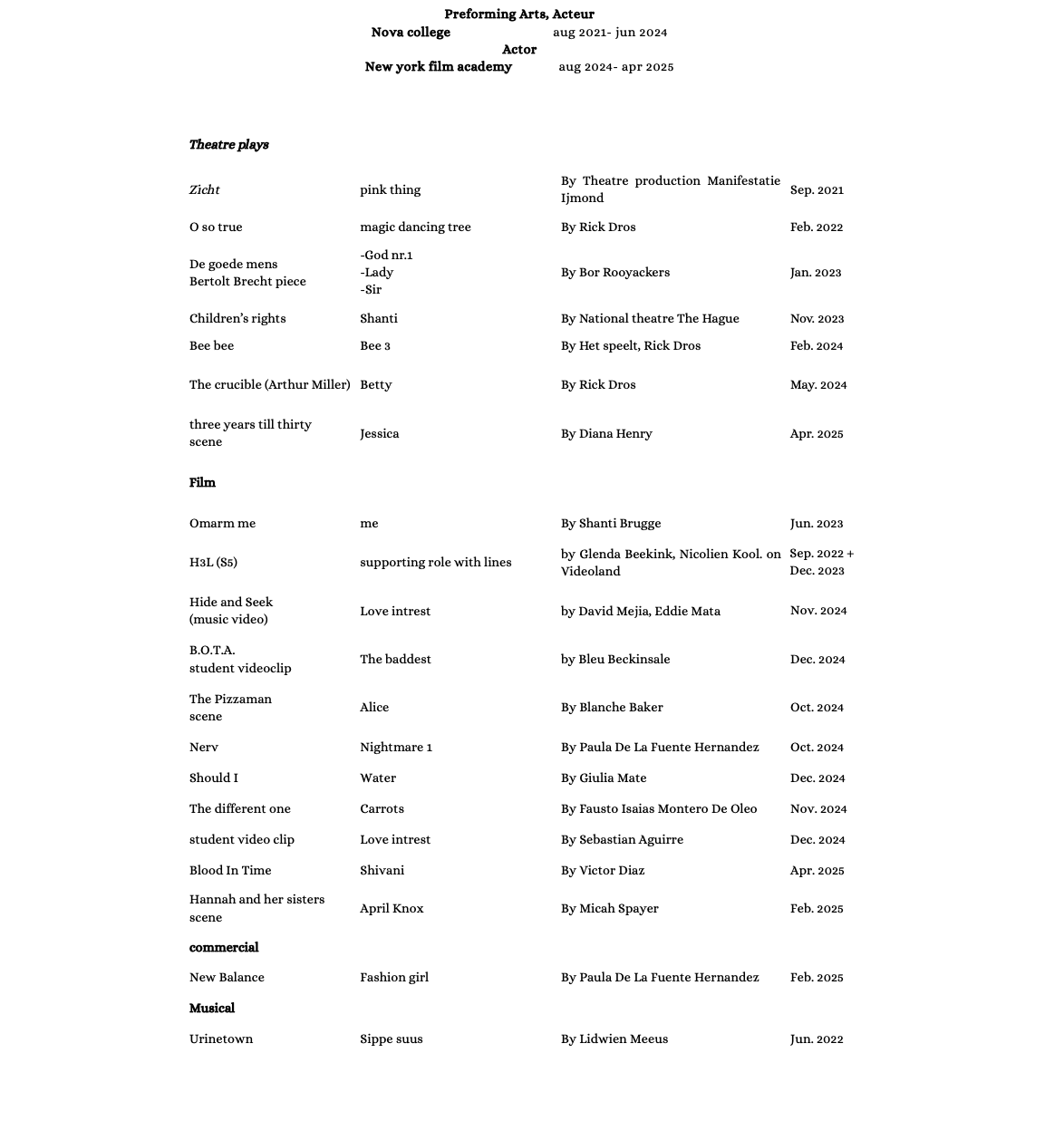 Growing up I always danced and I started modeling at the age of 15. I truly am born to be in the arts. I used to perform in small dancing shows in The Netherlands. After graduating high school, I got in in the Preforming Arts, Actor program at Nova College in Haarlem (The Netherlands). There I discovered that my love for acting is infinite. After graduating the 3 year program I got in at NYFA, the Acting for Film Program. I love to learn and explore new sides of the human kind and I love to express it, to let everyone around me feel the beauty of life and the human kind.